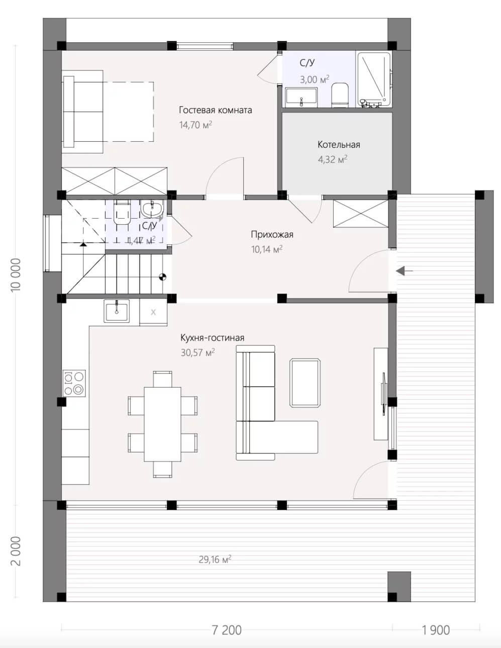 • Благодаря панорамным окнам в помещениях будет много света. За безопасность можно не волноваться, так как стекла противоударные.